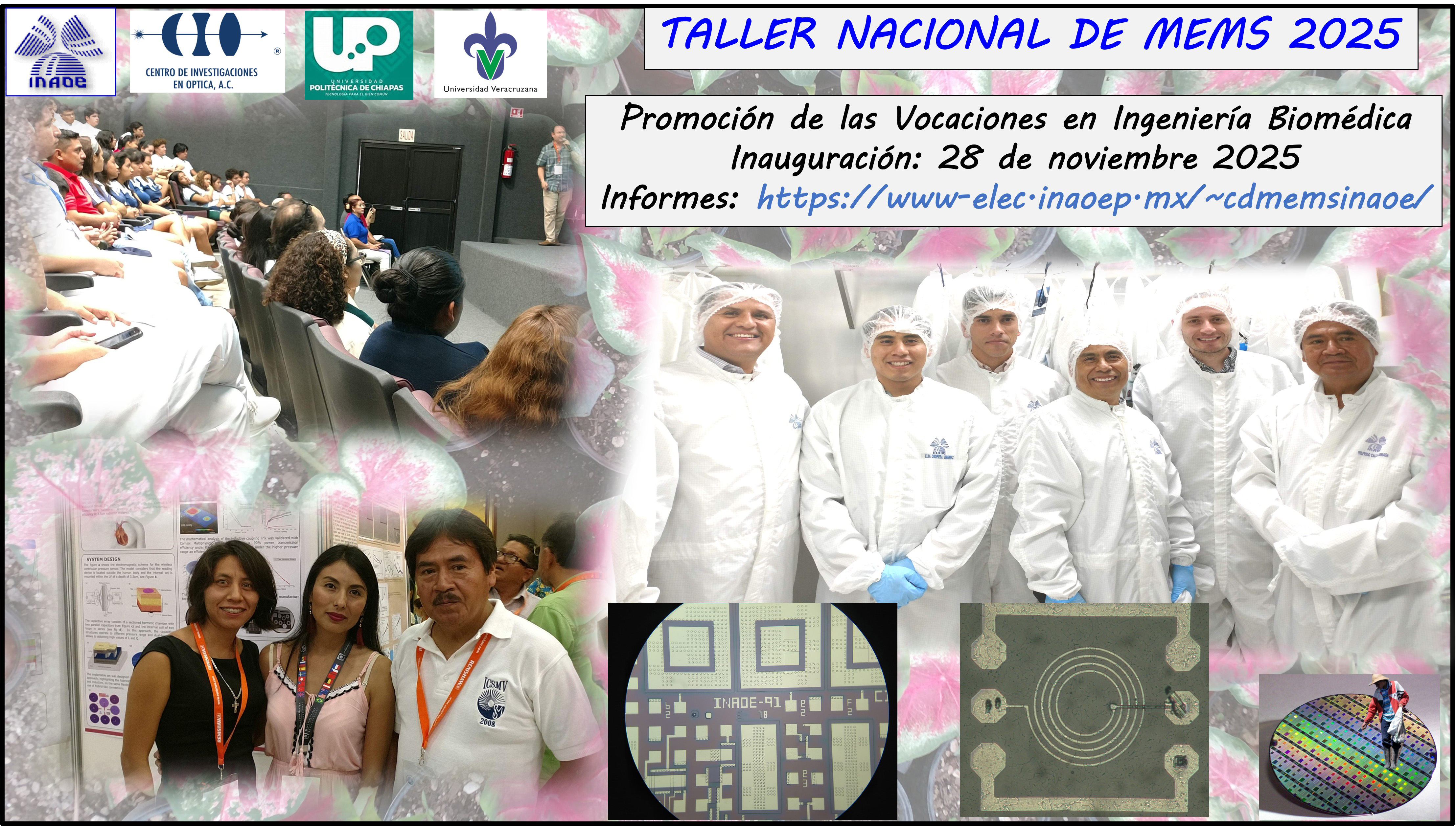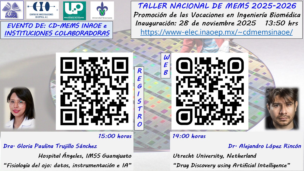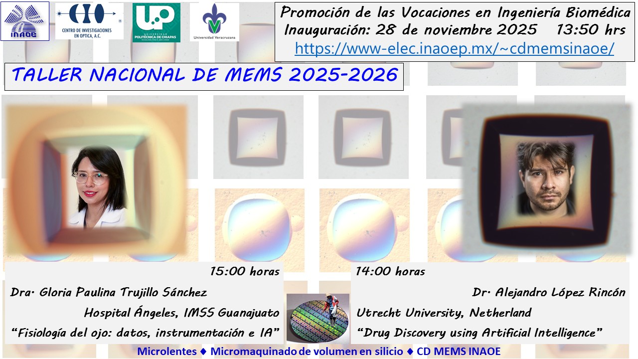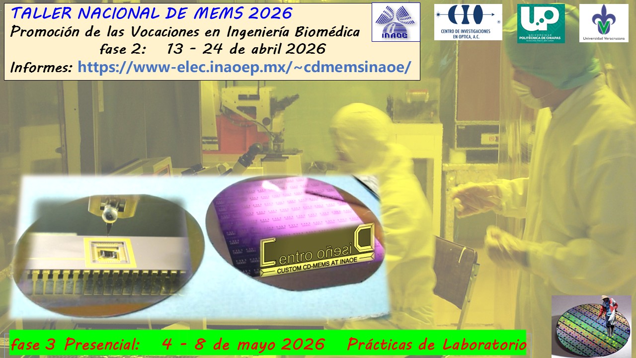 Este taller de tecnología con 40 horas de duración, relacionado con las Microtecnologías e Ingeniería Biomédica, se organiza de manera híbrida dirigido hacia estudiantes y profesionistas. El evento se desarrollará completamente en idioma español con la participación de conferencistas del país y del extranjero. Las actividades del taller se cubrirán complementariamente en nuestra infraestructura de sensores/MEMS y la participación de investigadores del Claustro CyT Biomédicas del INAOE.