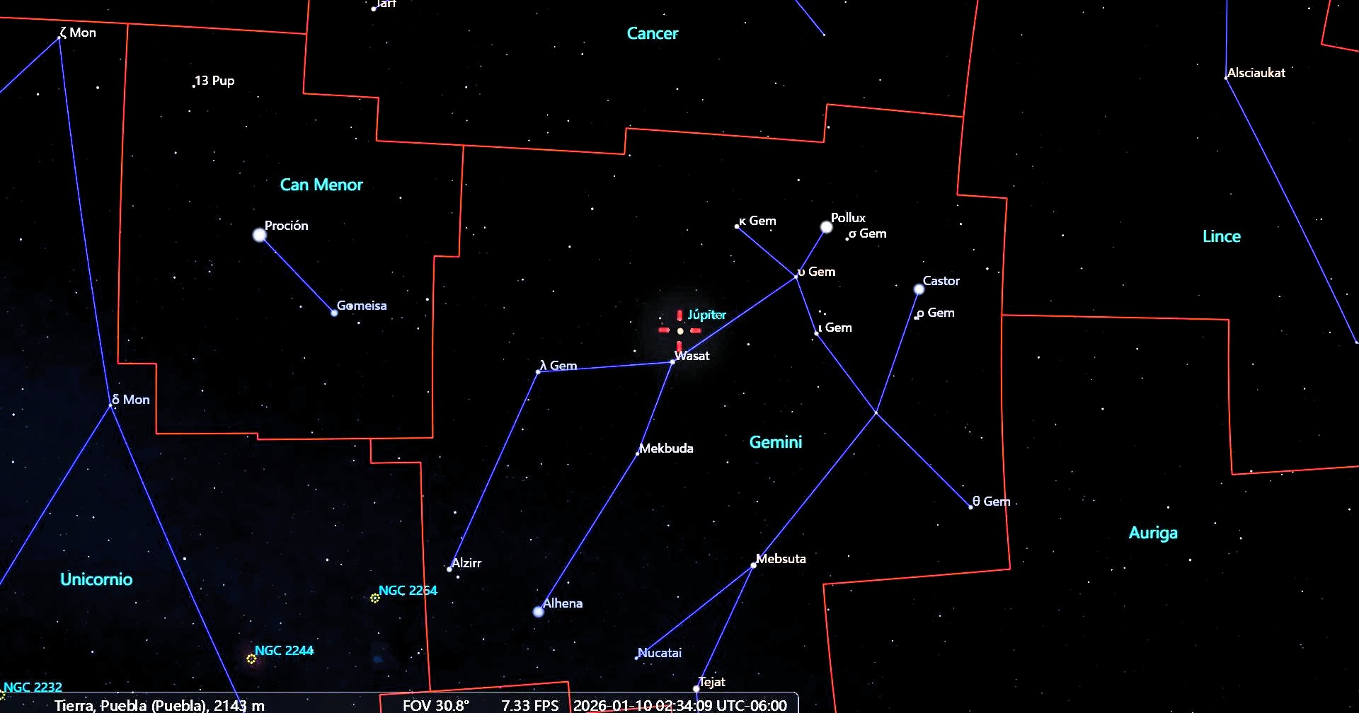 En la madrugada del día 10 de enero (2:34 horas del centro de México) el planeta Júpiter estará en oposición. En este momento, Júpiter, el mayor de los planetas del sistema solar, estará alineado con el planeta Tierra y ambos del mismo lado con respecto al Sol. Casi al mismo tiempo, Júpiter estará en su perigeo, es decir, estará muy cerca de su punto más próximo a la Tierra, a sólo 4.23 U.A., brillando con una magnitud aparente de -2,7. Ubicado en la constelación de Géminis, se podrá observar, en lo más alto del cielo, prácticamente a la medianoche. Es fácilmente localizable, no se requiere de binoculares o telescopios; ahora bien, si desea tener una maravillosa vista, con unos binoculares o un pequeño telescopio alcanzará a distinguir sus cuatro lunas, llamadas galileanas.