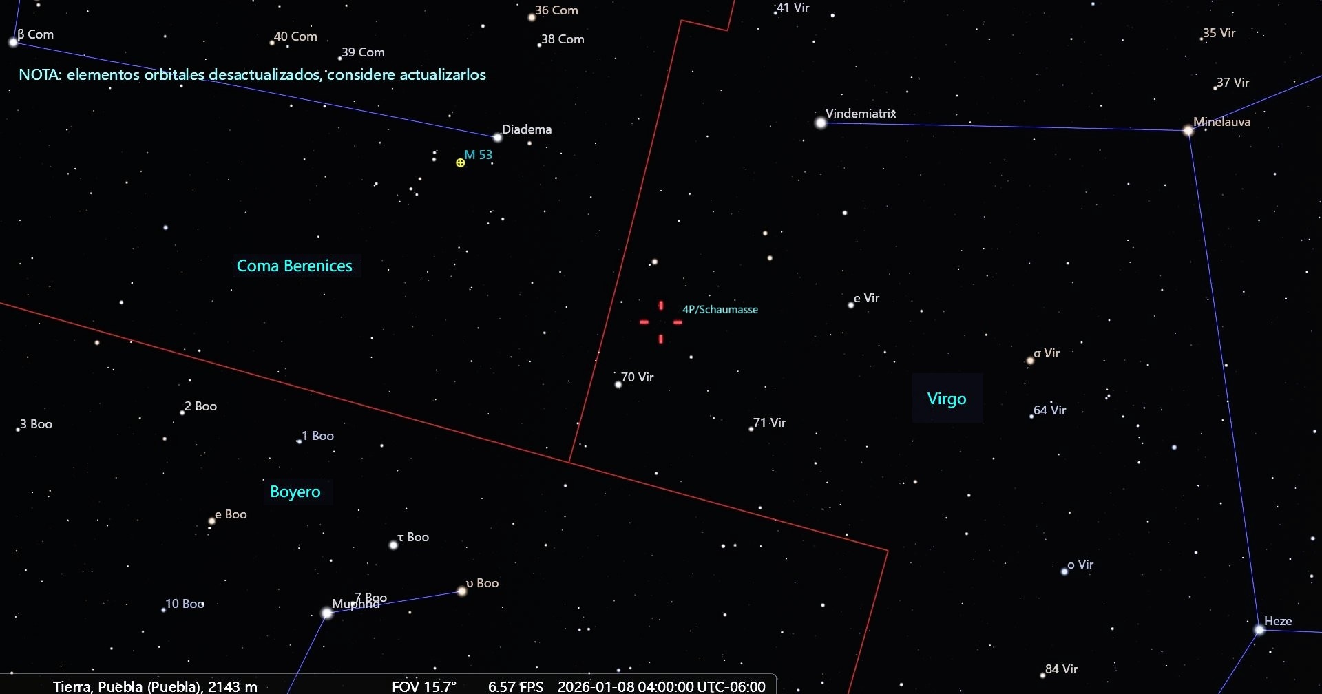 El 4 de enero, el cometa estará en su perigeo, es decir la distancia mínima a la Tierra, a solo 0.59 UA, el día 7 de enero el cometa alcanzará su máximo brillo, entre 9 y 8 magnitudes; finalmente, no se pierdan, el 8 de enero, al Cometa 24P / Schaumasse en perihelio, realizando su máximo acercamiento al Sol, a una distancia de 1.18 UA, alcanzando una magnitud 8.5 en dirección de la constelación de Virgo. Para ubicarlo se requiere de unos binoculares o un telescopio pequeño.