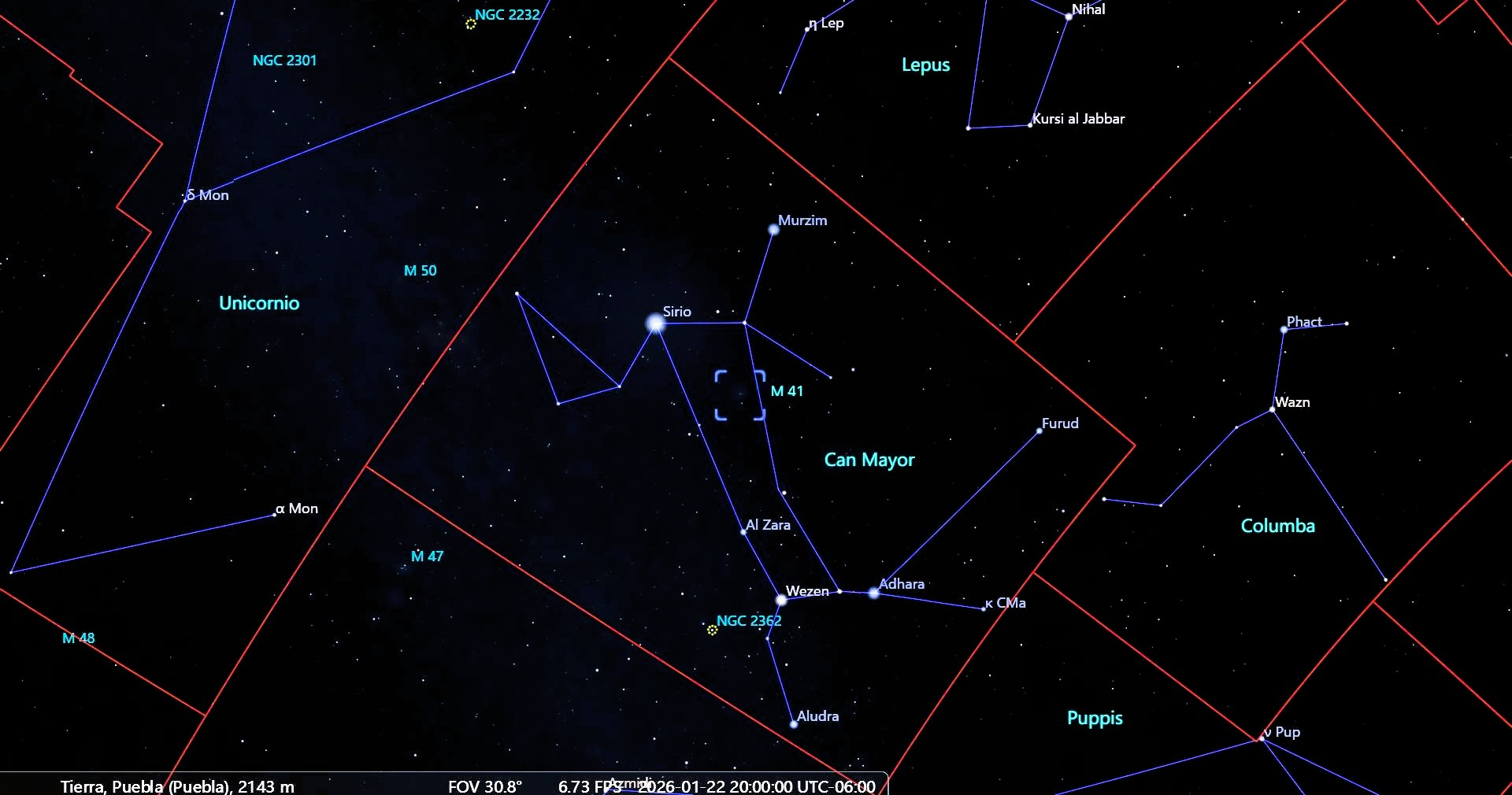 El cúmulo abierto M41 se localiza en dirección de la constelación del Can Mayor, a unos 4° de la estrella más brillante del firmamento: Sirio.
