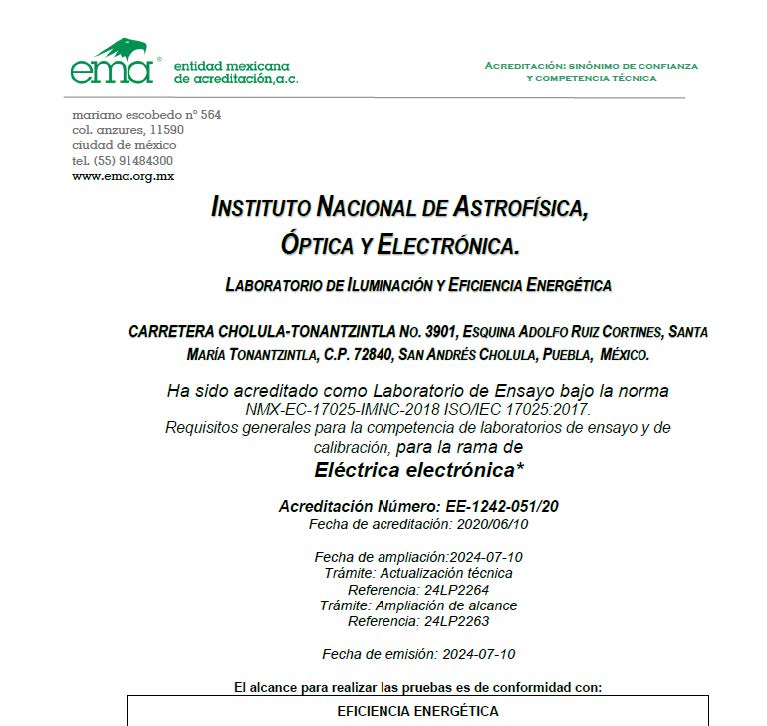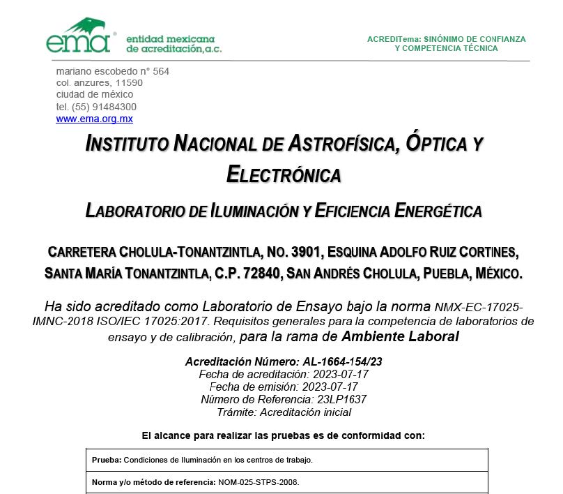 El Instituto Nacional de Astrofísica, Óptica y Electrónica (INAOE), creado por decreto presidencial el 12 de noviembre de 1971, tiene como objetivos realizar y fomentar actividades de investigación científica básica y aplicada, en materias que incidan en el desarrollo y la vinculación de México, el desarrollo experimental, la innovación tecnológica y la formación especializada de capital humano en los campos de la astrofísica, la óptica, la electrónica, las telecomunicaciones, la computación, la instrumentación y demás disciplinas afines, así como difundir los resultados de sus investigaciones. Uno de los laboratorios adscritos a la Dirección de Investigación y de Desarrollo Tecnológico, es el Laboratorio de Iluminación y Eficiencia Energética (LIEE). Dicho laboratorio está acreditado por la entidad mexicana de acreditación (ema) y aprobado por la Comisión Nacional de Uso Eficiente de la Energía (CONUEE) conforme al artículo 55 de la Ley de Infraestructura de la calidad.