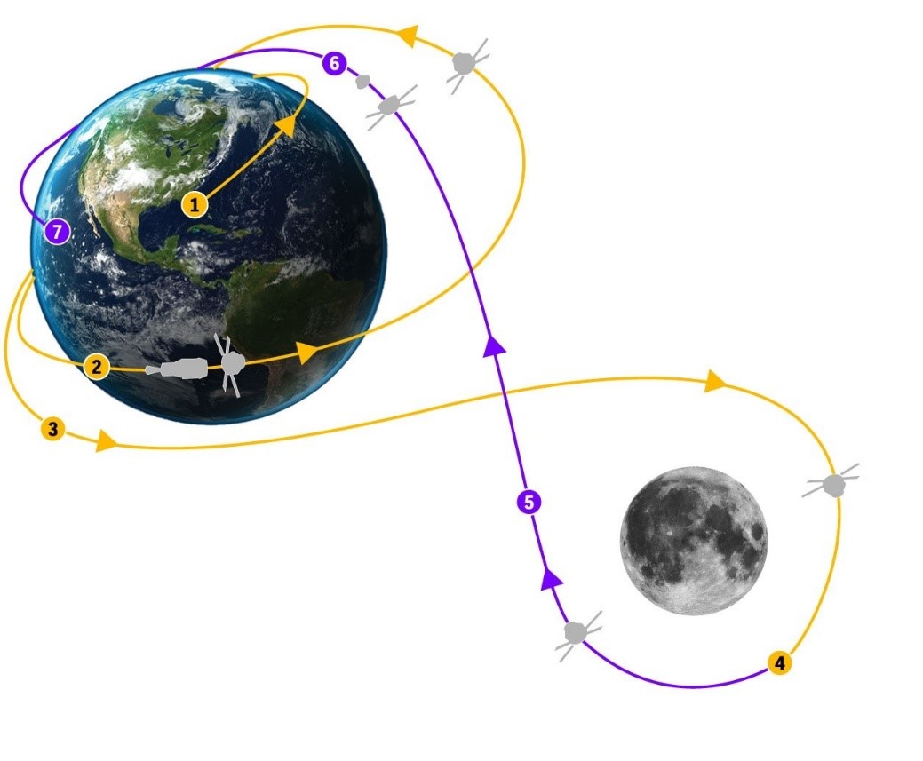 Figura 2. Representación gráfica de la trayectoria que va a seguir la nave Orión, de la misión Artemis II, en su viaje alrededor de la Luna. (Tomado de https://www.telemundo31.com/noticias/eeuu/artemis-ii-astronautas-orbita-tierra-orion/2404613/).