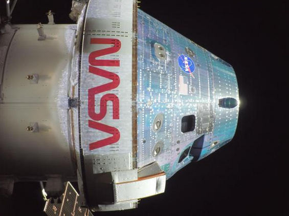 Figura 4. Imagen de la nave Orión tomada por una cámara que lleva la misma nave montada en la estructura que sostiene los paneles solares. (Créditos NASA).
