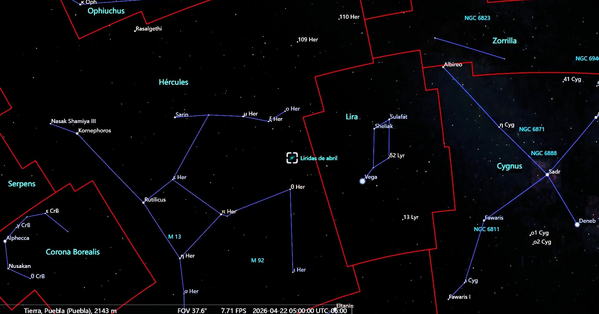 La lluvia de meteoros de las Líridas tendrá actividad entre los días 16 y 25 de abril, con un máximo el 22 de abril. La tasa máxima observable será de hasta 18 meteoros por hora. El radiante se encuentra en dirección de la constelación de Hércules, con coordenadas AR=18h00m, DEC=34º00´. Las Líridas son generadas por el cometa C/1861 G1 Thatcher y serán observables desde las primeras horas del día 22 y hasta el amanecer del 23, hacia la parte noreste de la esfera celeste.