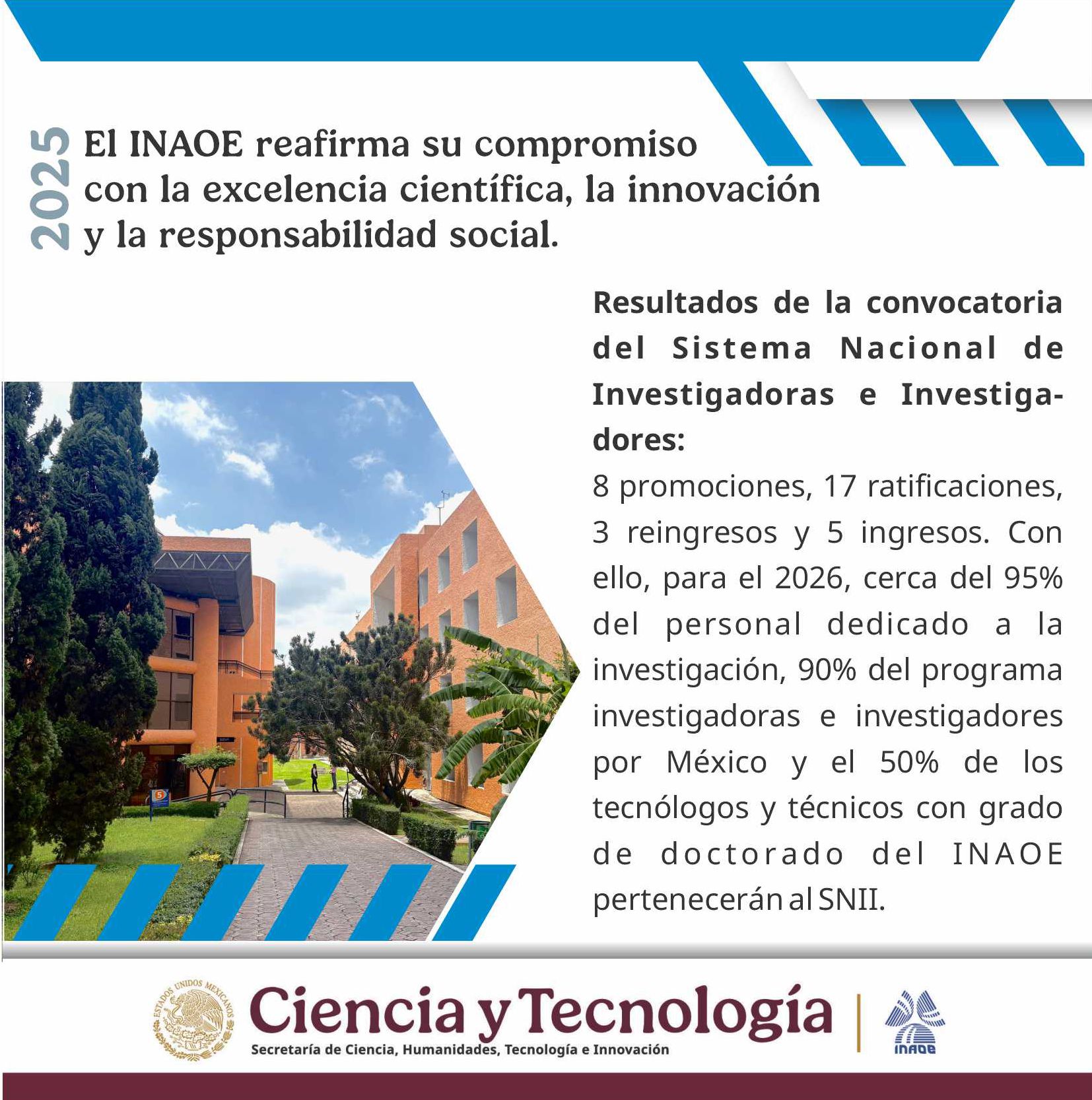 Resultados de la convocatoria del Sistema Nacional de Investigadoras e Investigadores (SNII): 8 promociones, 17 ratificaciones, tres reingresos y cinco ingresos. Con ello, para el 2026 cerca del 95 por ciento del personal dedicado a la investigación, el 90 por ciento del programa investigadoras e investigadores por México y el 50 por ciento de los tecnólogos y técnicos con grado de doctorado del INAOE pertenecerán al SNII.