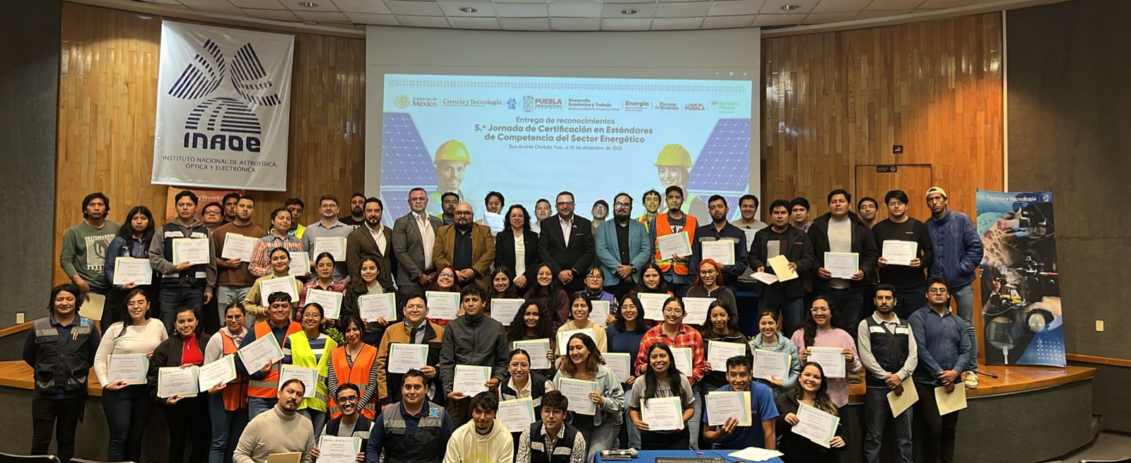 El pasado 10 de diciembre, el Instituto Nacional de Astrofísica, Óptica y Electrónica (INAOE), la Fundación Iberdrola México, la Agencia de Energía del Estado de Puebla (AEEP) y Consultoría Sustentable G2H entregaron los reconocimientos a los participantes de la Quinta Jornada de Certificaciones en Estándares de Competencia del Sector Energético.