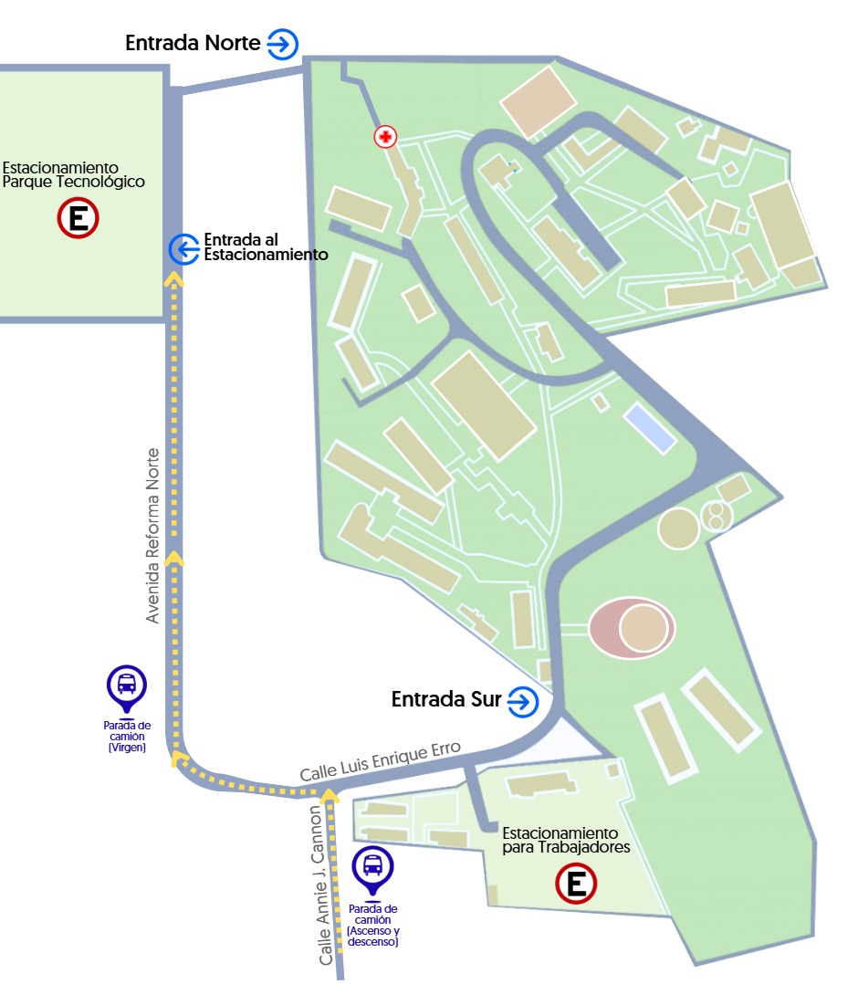 d) La institución visitante deberá pedir al chofer de su autobús que deje a los estudiantes en la esquina de la Calle Luis Enrique Erro y que después se estacione en el Parque Tecnológico Institucional (consultar mapa), ubicado en la carretera Tonantzintla-Cholula, a unos 500 metros del INAOE.